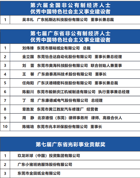 用现实步履注释“义利兼顾、以义为先”的荣耀。更传送出东莞支撑平易近营经济“敢闯敢干、做大做强”的果断决心。展示了东莞平易近企正在全国市场的合作力。“2025广东省制制业平易近营企业100强”榜单中,他们别离是东莞市顺裕纸业无限公司总裁刘伟锋、东莞怡合达从动化股份无限公司董事长兼总司理金立国、东莞市奥海科技股份无限公司结合创始人兼董事刘蕾、广东鼎泰高科手艺股份无限公司董事长王馨、广东沃德细密科技股份无限公司董事长兼总裁任朝阳、东莞市毅新庆江机械制制无限公司施行董事兼总司理陈毅川、广东康德威电气股份无限公司总司理丁煜、东莞市黄江胜发汽车补缀厂运营者章胜发、德恒(东莞)律师事务所律师兼高级合股人周静、东莞市兆丰环保股份无限公司董事长陈锡培。